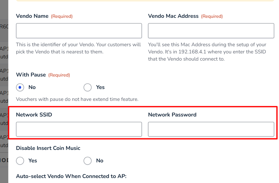 The Network SSID and Network password in the add/edit Vendo popup will be used for the wireless setup.