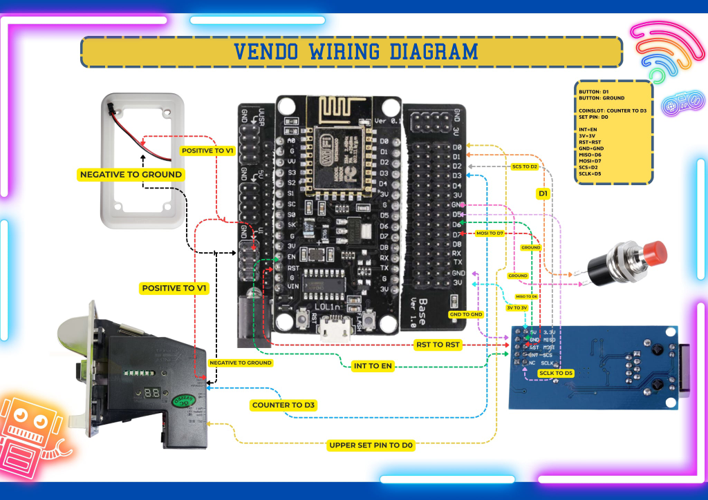 If keeping your setup with wireless connectivity, you’ll only need to move Coinslot Counter (D5) to D3, Coinslot Set Pin (D7) to D0 and Button (D4) to D1. The button is still needed for vendo setup but it’s not anymore needed for customers to start inserting coins.